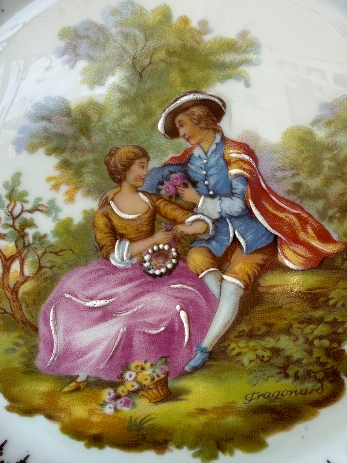 “Fragonard”, 18. yüzyıl Fransız ressamı Jean-Honoré Fragonard’ın adıdır. Limoges üreticileri özellikle 1950–1970 arasında, Fragonard’ın romantik sahnelerini (bahçe içinde çiftler, rokoko tarzı figürler vb.) fincan, tabak, vazoların üzerine transfer baskı veya el boyama olarak uygulamışlardır.